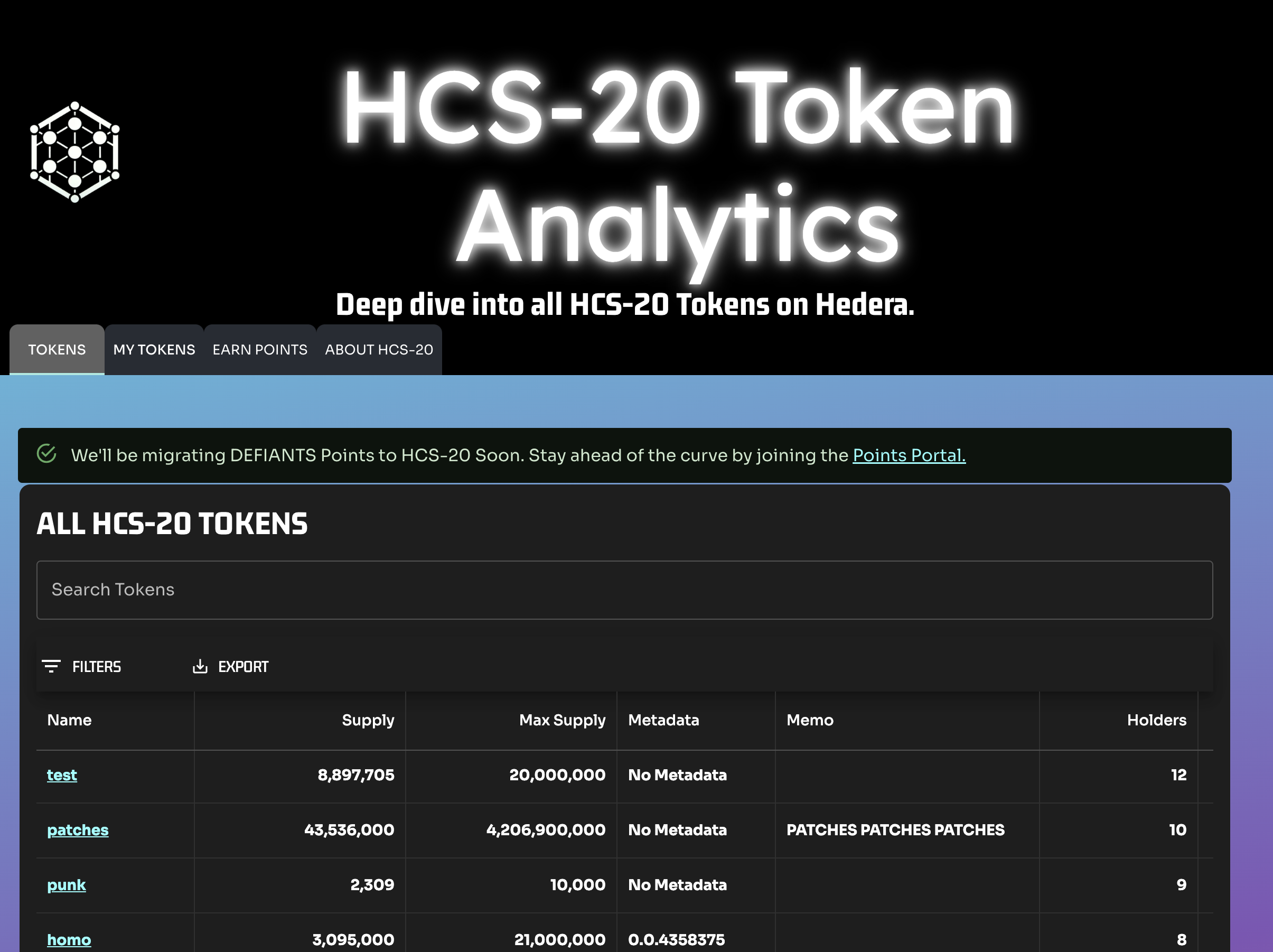* **Description**: Advanced analytics for HCS20. Explore balances, transactions, holder number amounts, and more.
